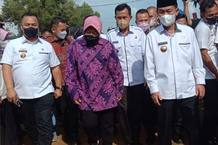 Lampung Utara – Menteri Sosial (Mensos) Republik Indonesia (RI), Tri Rismaharini didamping Bupati Lampung Utara H. Budi Utomo, S.E., M.M., dan Anggota DPR RI dari Fraksi PDIP I Komang Koheri menyambangi kediaman Badri bin Rusli, warga Dusun Peraduan Waras RT 06 RW 01 Desa Peraduan Waras, Kecamatan Abung Timur, Kabupaten Lampung Utara, Kamis (03/02/2022).