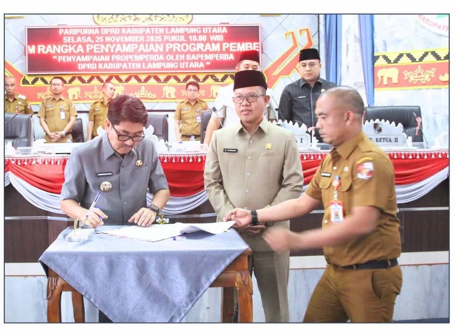 Lampung Utara, Review Indonesia – Dewan Perwakilan Rakyat Daerah (DPRD) Lampung Utara (Lampura) menggelar Rapat Paripurna dalam rangka pengesahan Program Pembentukan Peraturan Daerah (Propemperda) Tahun Anggaran 2026 yang dilanjutkan dengan pengesahan Rancangan Nota Keuangan dan Raperda tentang Anggaran Pendapatan dan Belanja Daerah (APBD) Tahun Anggaran 2026. Rapat berlangsung di Gedung DPRD Kabupaten Lampung Utara bersama jajaran Forkopimda. Selasa (25/11).