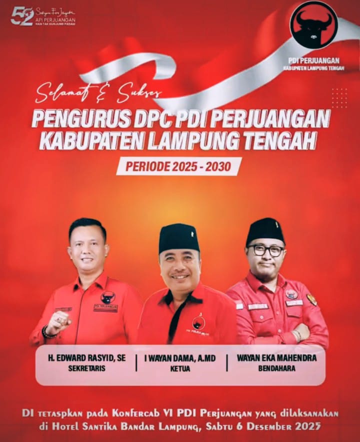 “Ini merupakan amanah yang harus dijalankan dengan baik dan penuh tanggungjawab. Tentunya, saya dan seluruh pengurus yang baru ini ingin mengembalikan kejayaan DPC PDI Perjuangan Lampung Tengah di Pemilu yang akan datang,” kata I Wayan Dama saat diwawancarai melalui via telepon WhatApps, Minggu (7/12/2025).